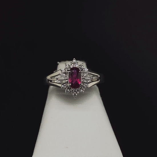 Platinum ring with a 0.56 center Ruby and 10 round diamonds and 6 baguettes totaling at 0.18 ctw.